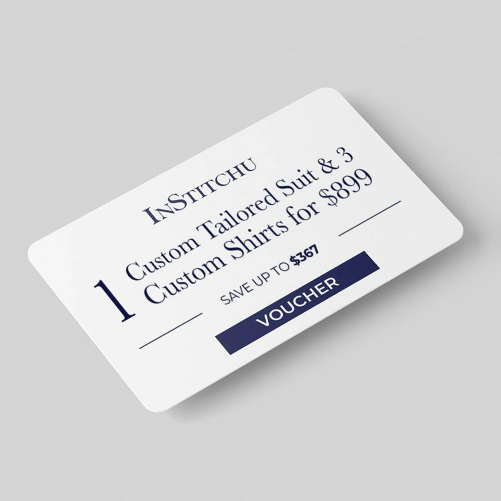 included::1 custom tailored two piece suit & 3 shirts |Choose from over 100 fabrics**|Fully customisable: lapels, linings, buttons and more**|Complimentary alterations if required|Redeemable online or at any InStitchu Showroom|Add any 3 Custom shirt upto $139* (Redeemable in Showroom)::included includedSecond:: *Any suit from our Core and Filarte range up to $1299 | **Some design details may incur an additional fee::includedSecond Terms and Conditions: The Voucher can be used to purchase items included in the InStitchu Suit / Shirt Pack only and will expire 12 months from the date of issue. Pack includes 1 x custom, tailored suit from our Essentials Range valued at up to $849 and 3 custom, tailored shirts up to the value of $139. The gift card offer is purchasable online only. Offer is redeemable online and in any InStitchu showroom, optional design extras that incur an extra charge are not included in the Suit Sale Pack, offer valid once per person for the duration of this promotion, cannot be used in conjunction with any other offer, InStitchu reserves the right to end the offer at any time and without notice and offer valid whilst InStitchu fabric ranges last. Offer purchasing ends at 11:59 pm, 30 June May 2025. Any orders under $1200 will incur a $39 Shipping and Handling Fee.