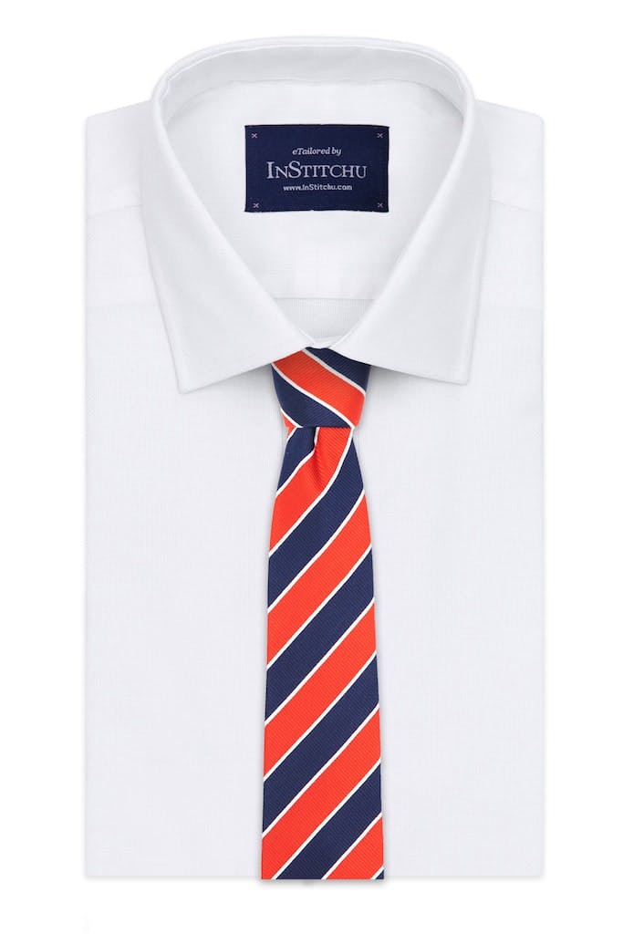 This red, navy and white silk tie is made of 100% silk and compliments a clean, white collared shirt perfectly. A traditional style with a preppy vibe, this tie sings when paired with a navy 100% Australian Merino wool custom, tailored InStitchu suit. The tie's bright red stripes are distinguished and eye-catching, for those looking for a tie with an extra something without being to over the top. We recommend tying this tie with a half-windsor knot, or a four-in-hand knot for this tie.