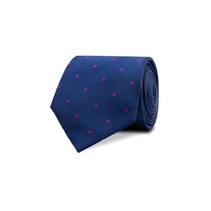 This fuchsia spotted navy tie would be your traditional navy silk tie, if it weren't for its fuschia spots, transforming the tie from plain to playful. You can wear this tie to work, or for your next wedding—however you decide to dress it up, or down, is up to you. We recommend styling this 100% silk tie with a half-windsor knot, or a four-in-hand knot.