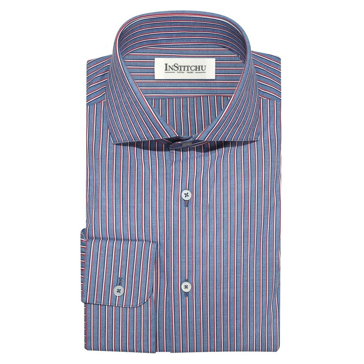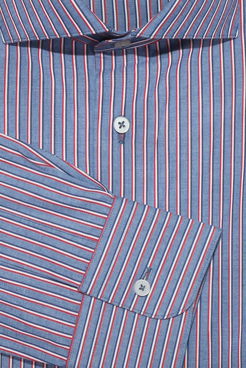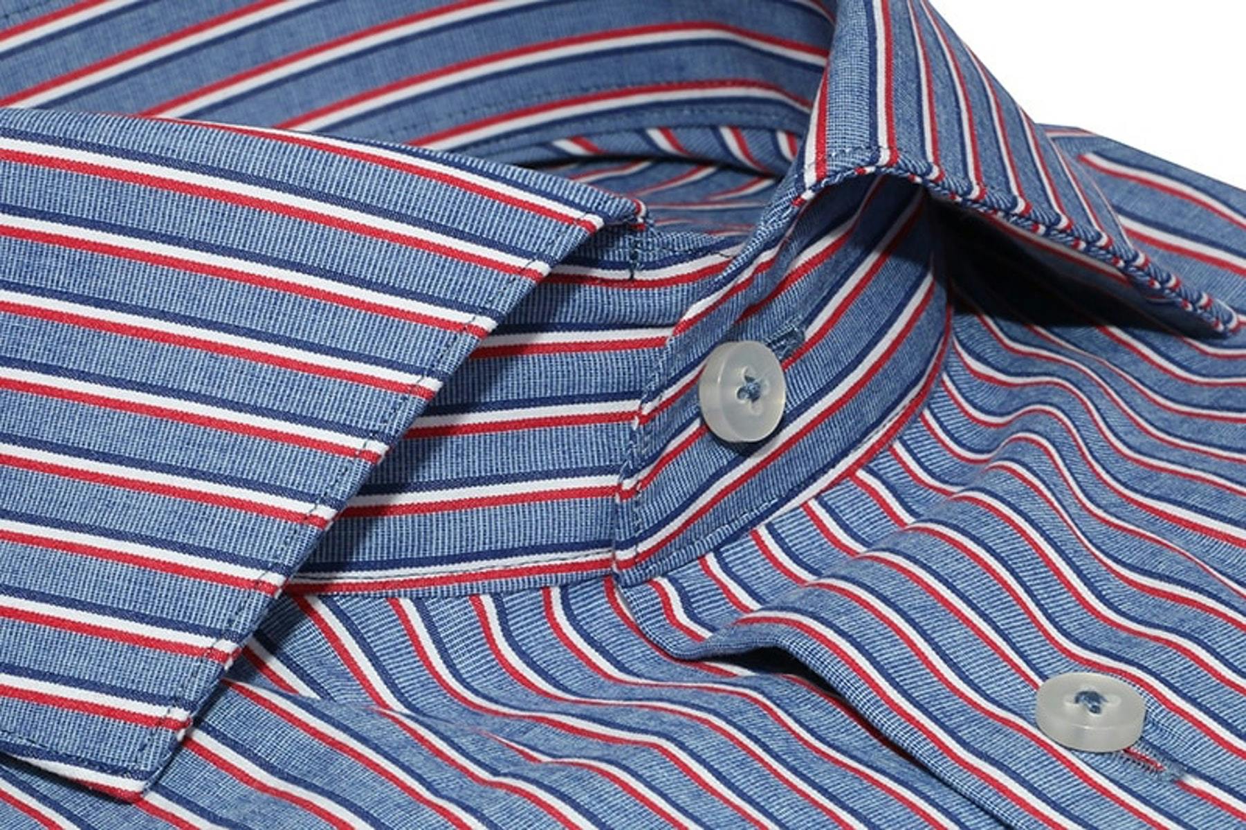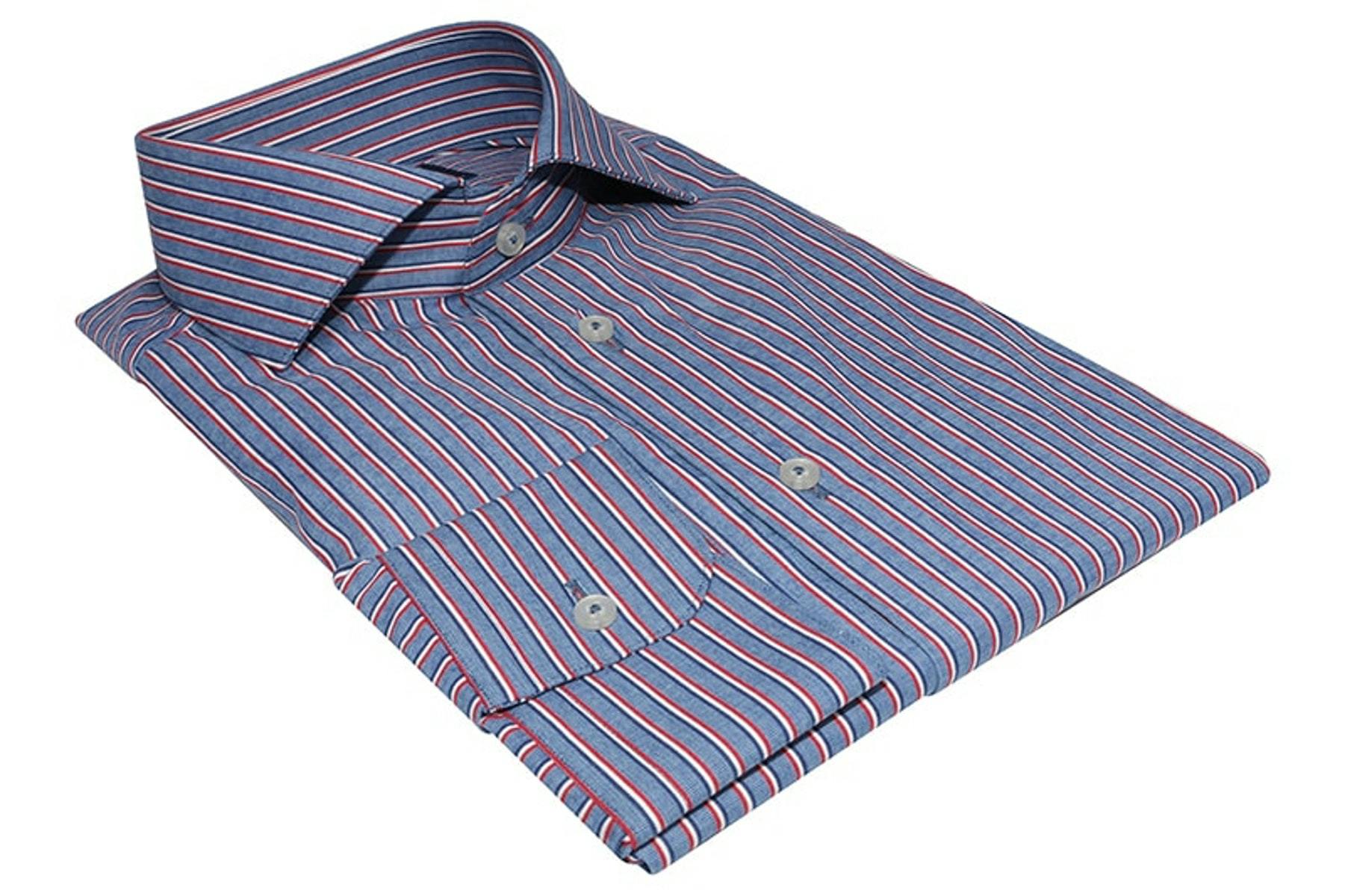 This made-to-measure casual shirt is a staple for your wardrobe. Crafted from 100% cotton, the blue and red stripes are a distinct Summer to Autumn transitional feature to add to your collection. Completely customisable and incredibly versatile and wearable garment. Select your desired features such as cuff, collars and button to your own taste.