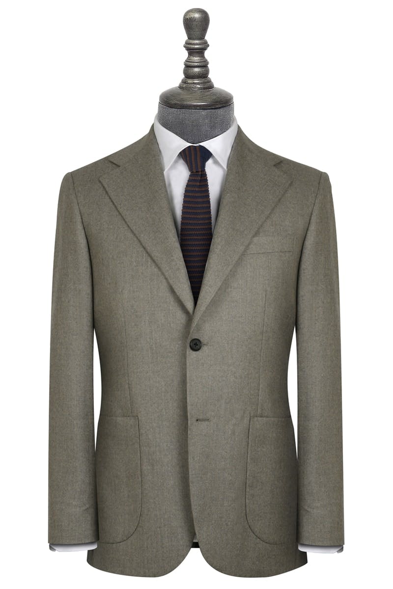 Our dark beige flannel custom, tailored jacket pairs well with a white custom, tailored shirt and our Jervis navy blue silk tie. Constructed from Woolmark certified 100% Australian Merino wool, this jacket is from the Italian milled Vitale Barberis Canonico collection and is perfect for the cooler seasons and comes completely customisable and can be made to your measurements. This jacket is featured here with patch pockets, notch lapels and a single breasted two button closure.